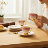Composé de 6 tasses assorties et 6 sous-tasses, ce service séduit par son design délicat rose et blanc, sublimé par des finitions dorées élégantes sur les anses et les bases.